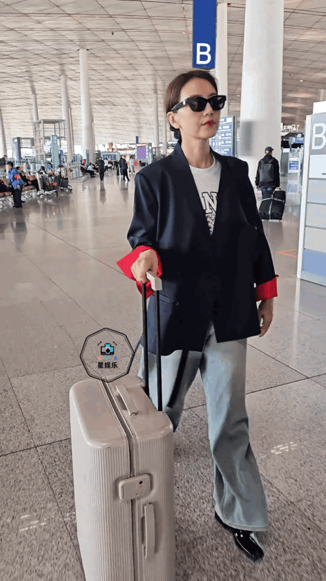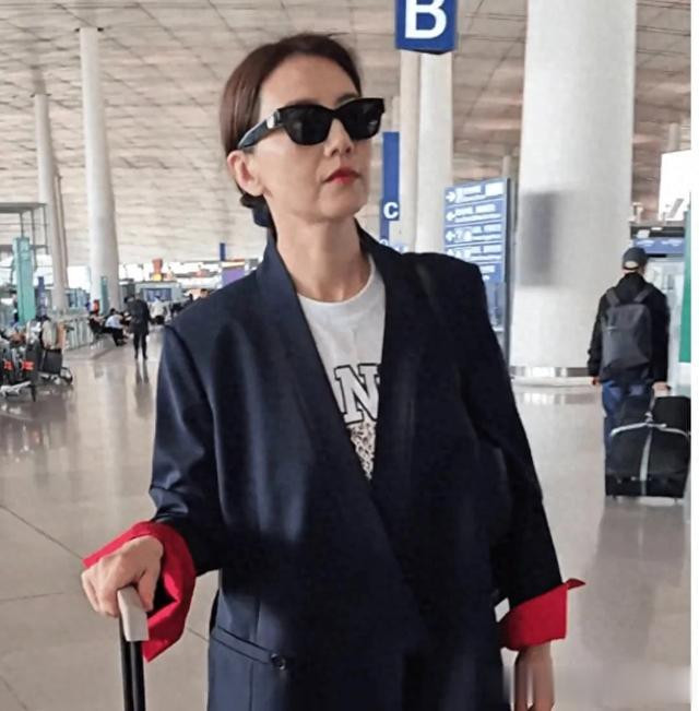 照片里高圆圆推着行李箱,穿着藏青色西装内搭T恤和一条浅色阔腿裤,穿搭一言难尽,看上去像保洁,还有点有点高低肩。黄棕色的头发,紧贴头皮,感觉发量也变少了。虽然用墨镜遮挡了眼睛,明显看得出高圆圆脸垮了,木偶纹和法令纹很深,可能是高圆圆的鹅蛋脸更容易垮,圆脸就相对抗衰一些。